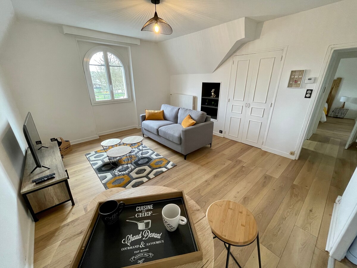 Útulný a velmi světlý byt ve druhém patře plně vybaveného buržoazního domu. Má soukromý vchod v zadní části domu, na straně zahrady. Vybavení: - Spaní: 1 velká manželská postel - Osušky k dispozici. - Vybavení domácnosti: kuchyň s varnou deskou, mikrovlnnou troubou, lednicí, kávovarem, nádobím a příbory. - Mediální vybavení: TV s plochou obrazovkou, WiFi připojení k internetu - volný venkovní prostor.
