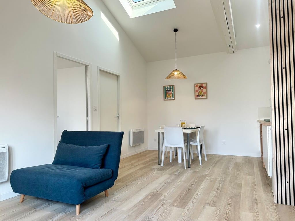 Appartement cosy de 39m2 entièrement équipé du centre ville (couple famille, professionnels) ✨ Points forts de votre séjour : Belle pièce à vivre avec cuisine ouverte et équipée Table à manger conviviale 4 personnes Salon chaleureux avec canapé convertible Chambre moderne (12 m²) Terrasse privée avec vue sur paysage arboré Place de parking réservée et gratuite Rez-de-jardin (quelques marches pour y accéder) 💼 Séjours professionnels bienvenus (calme, haut débit, proximité commodités)