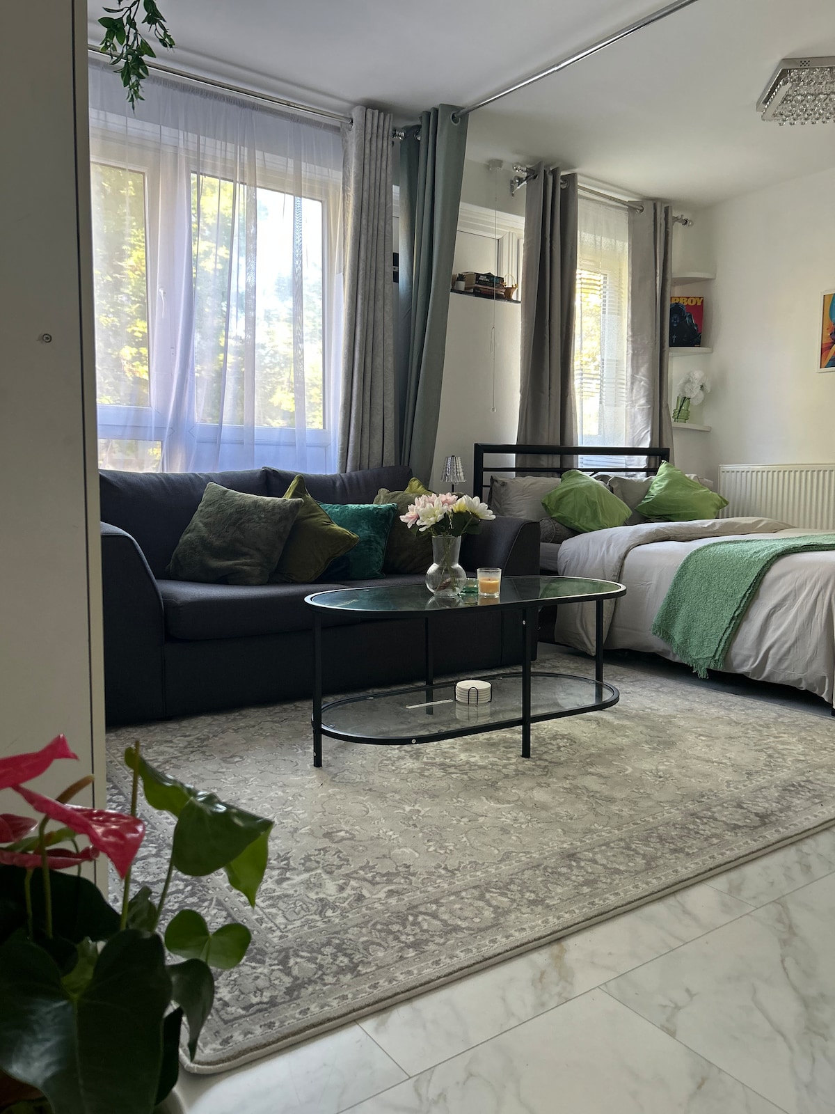 Probuď se s inspirativními výhledy na Londýn z bujarého balkonu tohoto prosluněného samostatného apartmá. Vařte v kuchyni s elegantními, efektivními skříňkami a dejte si snídani u barového stolu u okna, které umožňuje další výhledy. (Vezměte prosím na vědomí, že zde je společná chodba a technická místnost, ale jednotka má uzamykatelné dveře a je zcela samostatná) Pokud budeš něco potřebovat, dej mi vědět a já udělám maximum, aby byl tvůj pobyt co nejplynulejší a nejpříjemnější!