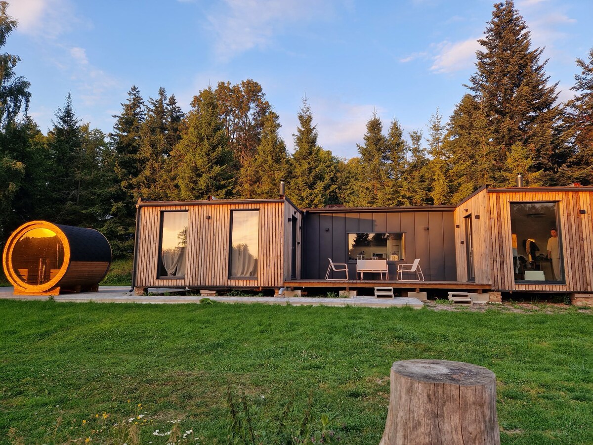 V TUFITECH- Zažijte pravý glamping pár kroků od tufitového lomu s výhledem na Slezskou Hartu. Stylový kontejner nabízí pohodlí s elektřinou a vodou – najdete tu postel, kamna, rozkládácí gauč, kuchyňku, plynový vařič, nádobí, barel s pitnou vodou, jednu zásuvku a LED osvětlení. Užijte si ticho, dechberoucí západy slunce z horní terasy a večery u ohniště. K dispozici suchý záchod a možnost zapůjčení paddleboardu či loďky. Ideální místo pro digitální detox a odpočinek v přírodě.