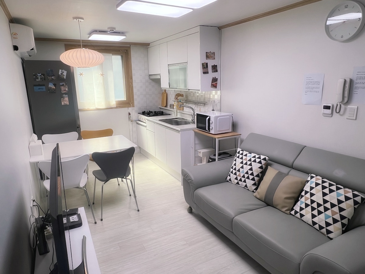 M.PLACE se nachází v klidné rezidenční oblasti poblíž stanice Kačiul (linka 7). Nachází se ve 3. patře a je to prostor, kde můžete cítit teplo a vintage díky dřevěnému nábytku a podlaze v bílém tónu. Hlavní ložnice (pokoj A) je spojena s terasou a ráno je osvětlena východním sluncem a po 16:00 západním sluncem. K dispozici jsou 2 pokoje, jeden menší, a také obývací pokoj, kuchyně a koupelna. Ubytování se nachází v roztomilé rezidenční oblasti s kavárnou, takže si můžete užít klidnou scenérii a zároveň si užít prohlídku exotických kaváren. Níže jsou uvedeny prostory, které nabízíme. a. Pokoj A – zde se nachází pohovka, na které si můžete odpočinout, a venkovní terasa. b. Pokoj B - menší než pokoj A, vybavený postelí a věšákem. c. Kuchyně – je vybavena základním kuchyňským vybavením. c. Koupelna - Sprcha a toaleta jsou čisté a dobře vybavené. * Protože se jedná o klidnou rezidenční oblast, není možné pořádat večírky.