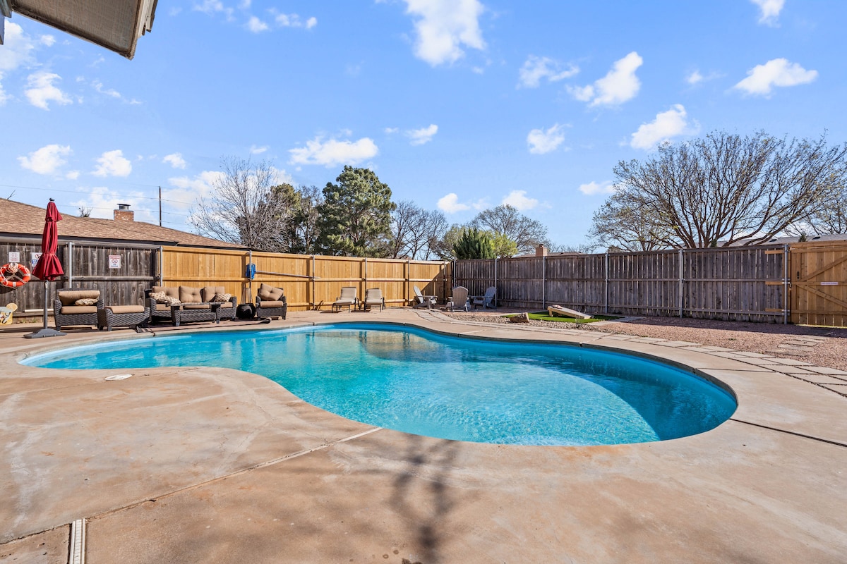 Vítej v The Prickly Pear – tvém útočišti v západním Texasu! Odpočiň si v tomto prostorném, okouzlujícím domě v klidné čtvrti, ideálním pro rodiny, přátele nebo výlety na zápas. ★ Útulný, moderní nábytek pro pohodlí ★ Oáza na zahradě s bazénem, vířivkou, lehátky a cornhole ★ Plně vybavená kuchyně ★ 3 chytré televize a rychlá wifi 300 Mbps ★ Zábavné stolní hry pro kvalitní trávení času ★ Kroky od malebného jezera „playa“ a turistické stezky 📍 4 minuty do obchodů a restaurací | 9 minut do Texas Tech | 19 minut na letiště