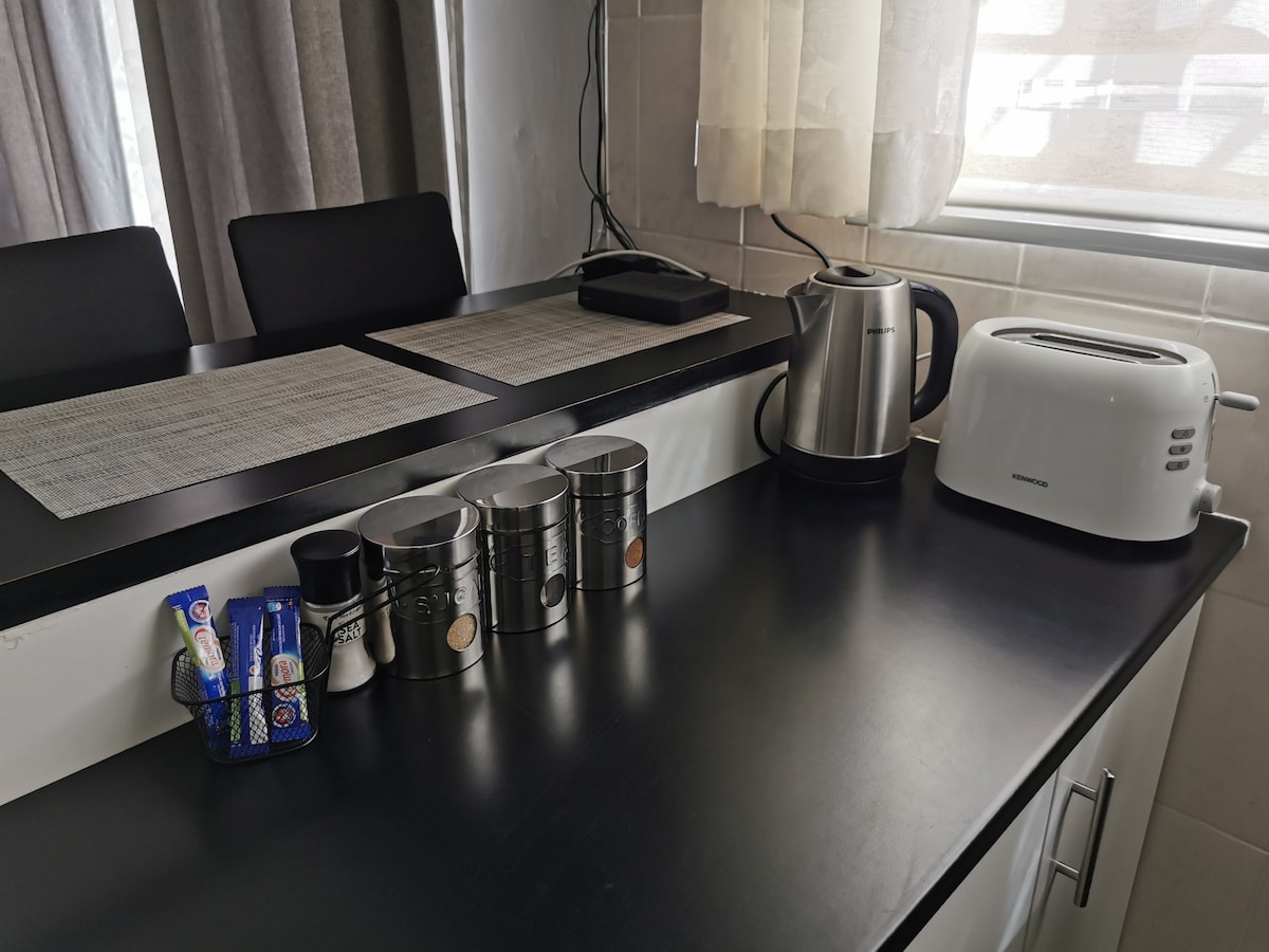 This unique place has a style of its own. Enjoy your stay in this compact studio apartment designed for sleeping, eating & dining. The kitchenette is fully equipped with a gas hob, mini fridge, & microwave. There is a separate bathroom with a shower. TV with DSTV (cable TV) is available, as well as wifi access. For backup electricity, there is a solar system The studio apartment is attached to the main house, with its own outside entrance, & parking on site.