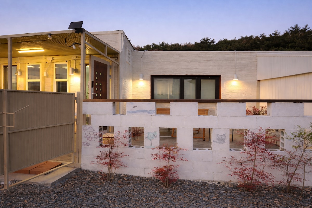 Je to krásná krajina jezera Deokdong a čistá oblast bez hluku. Můžete se v klidu procházet a odpočívat s ptačím zpěvem a čistým vzduchem, navštívit starověké památky v Cheongnyeon, poblíž se nachází jezero Bomun, CC Gyeongju Silla, Gyeongju World, Blue One Resort, Bulguksa a Seokguram. V přízemí domu pro hosty (hostitel bydlí ve 2. patře) jsou 2 ložnice, 2 koupelny, obývací pokoj, kuchyně a jídelna, takže je to ideální místo pro rodinné oslavy nebo setkání s přáteli. Možnost pořádat večírky (až pro 6 lidí) Luxusní zahradní dům ideální pro romantický víkend. Dům navržený architektem Getaway nabízí klidnou atmosféru obytní atmosféry. Obdivujte moderní výzdobu otevřeného obytného prostoru a vychutnejte si klidné okolí z roztomilé terasy.