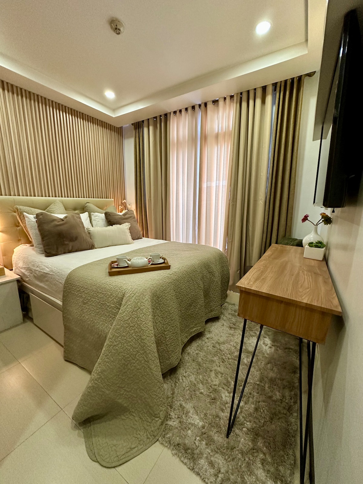 A modern condominium located in Baguio City, providing you a comfortable place to stay with beautiful views of the mountains and the city. Offering comforts and space that allows guests not just to stay but to live! Amenities: - Dedicated Parking Slot - Viewing Deck - Hot and cold shower - 50" Smart TV (with Netflix) - Coffee Bar - Fiber Wi-Fi - Microwave Oven - Refrigerator - Induction Cooker - Cookwares - Plates, glasses and eating utensils - Ceiling fan in both bedrooms