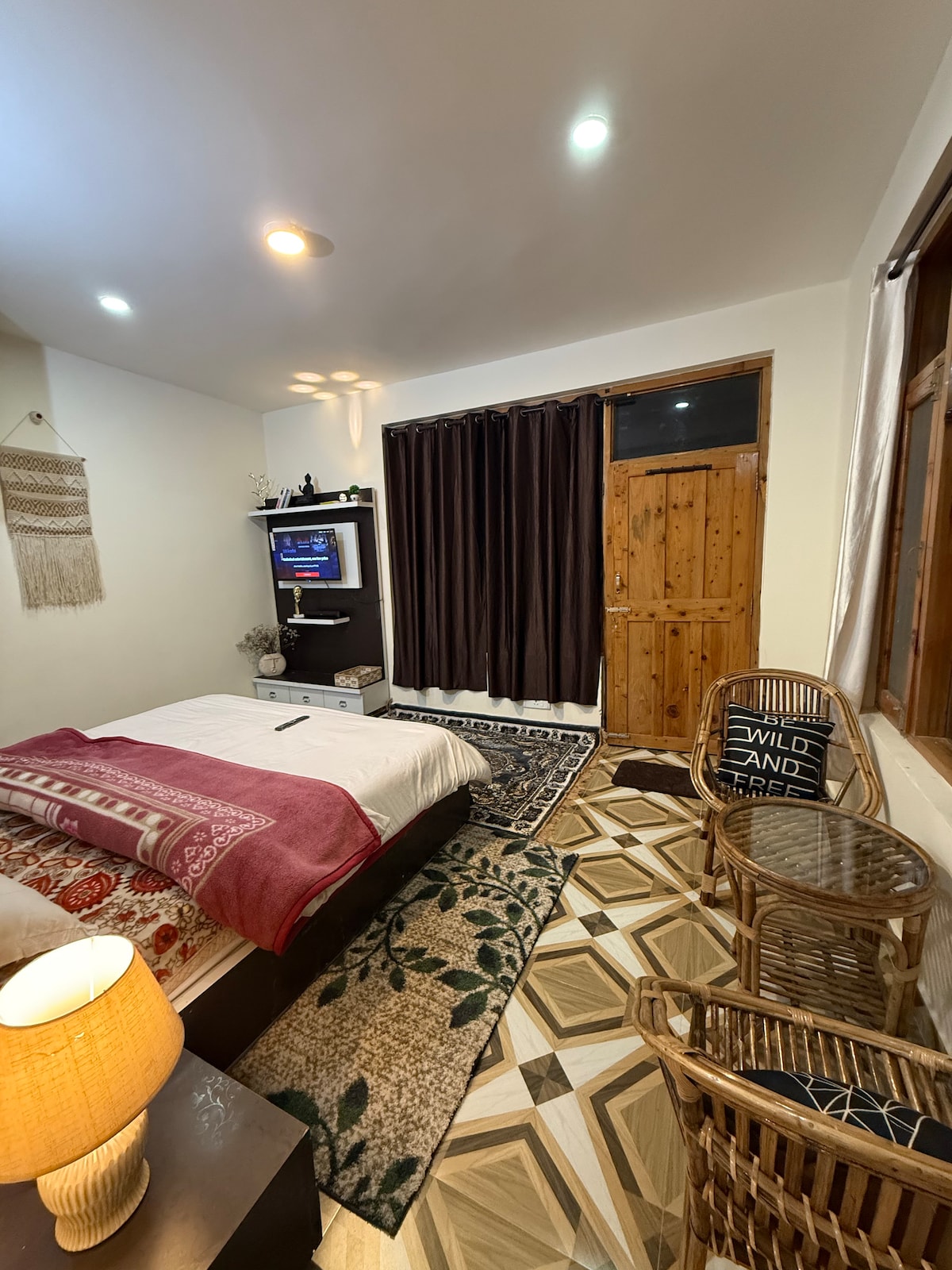 Nově postavený dvojitý luxusní pokoj stojící na vrcholu hory v Manali. Je to soukromé místo, kde jsou v blízkosti pouze 2–3 domy, ne více. Toto ubytování je neuvěřitelně okouzlující. Ze svého pokoje uvidíte celé údolí a ledovcem zatíženou Himalájskou pohoří Kullu – údolí Manali. Tento zbrusu nový pokoj s manželskou postelí má připojený kuchyňský kout, hygienickou koupelnu, studijní stůl, Wi-Fi a veškeré základní vybavení.