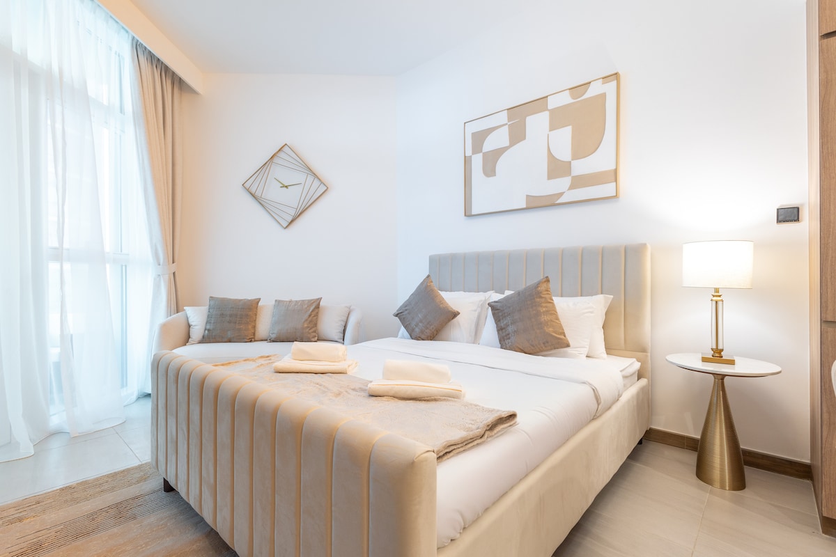 The stunning views from this waterfront studio will stay with you. • Immediate downtown access. • ≈5-min to Dubai Mall | 15-min to Airport. • 24/7 grocery store in the building. • Coffeeshops, restaurants and services around. • By beautiful canal walk. • Pool and gym access. • Huge 4K TV with sync lighting. • Great security and free parking. • Cozy, sleek and luxurious. A tiny apartment with everything you need. Ideal for couples or business travelers.