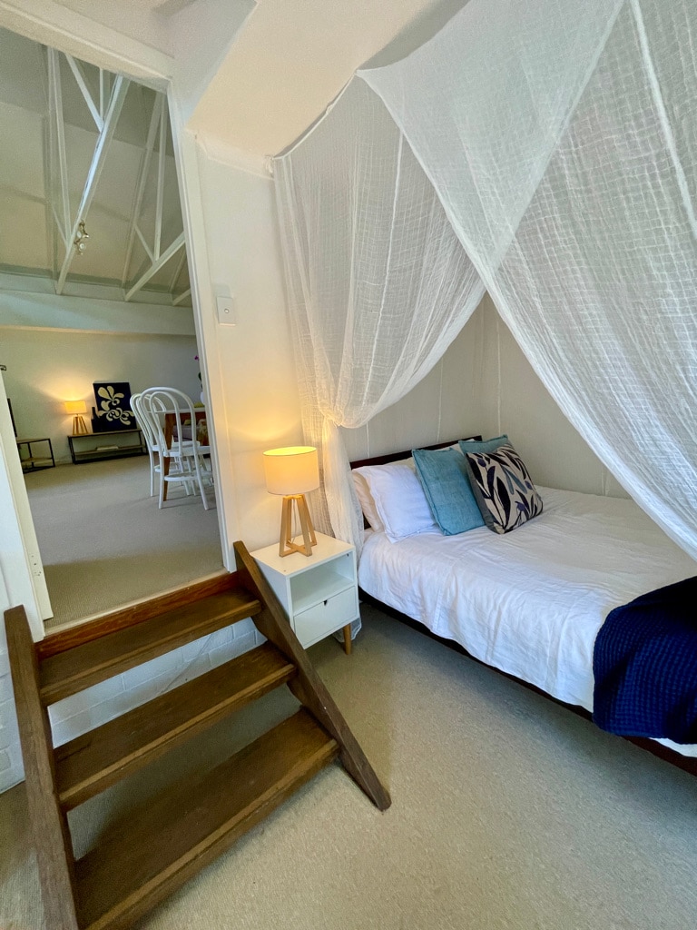 Lofty and romantic architecture in the best spot in Byron. Spi v baldachýnech v mezipatrové ložnici, probuď se s zpěvem ptáků + sprcha pod hvězdami pod masivním starým hedvábným dubem. Vyjdi dveřmi + na lesní trasu, která tě zavede národním parkem Arakwal na klidnou pláž s posvátným čajovým jezerem. Jsi 200 metrů od oblíbené kavárny a restaurace v Byronu, Roadhouse, kde si můžeš dát kávu ráno, koktejly a pizzu večer.
