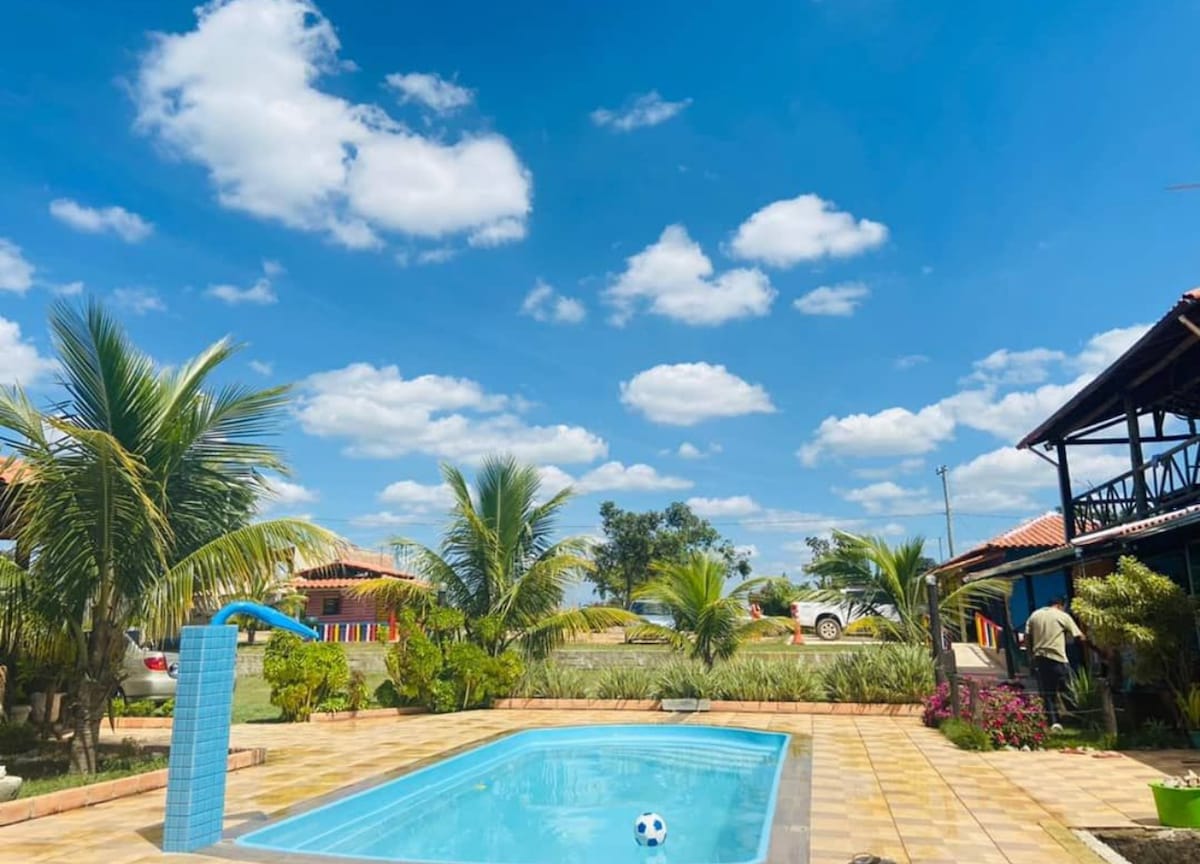 Ranč se nachází v čtvrti Cidade Jardim v Esmeraldas (MG), jen hodinu od Belo Horizonte a asi 6 km od centra města, což nabízí snadný přístup, aniž byste se vzdali klidu a kontaktu s přírodou. Probuď se za zpěvu divokých ptáků, projdi se mezi ovocnými stromy krásného sadu a užij si klidné prostředí, kde si můžeš odpočinout nebo dokonce pracovat na dálku s klidem v duši.