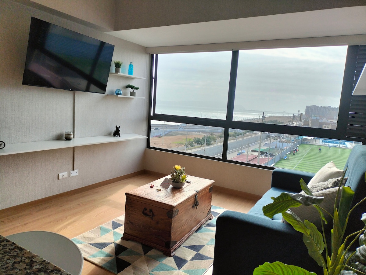 Apartment for 2–3 guests, on the third floor, with partial ocean view from the bedroom. Features 1 bedroom with a double bed and a sofa bed in the living room. The building offers laundry facilities, BBQ area, game zone, WiFi lounge and jogging area. Strategic location, 2 minutes from Costa Verde and 15 minutes from Miraflores and Barranco. Security cameras only in common areas, none inside or facing the apartment. Self check-in 24/7. Amazon Prime Video included. Ideal for couples and remote w.