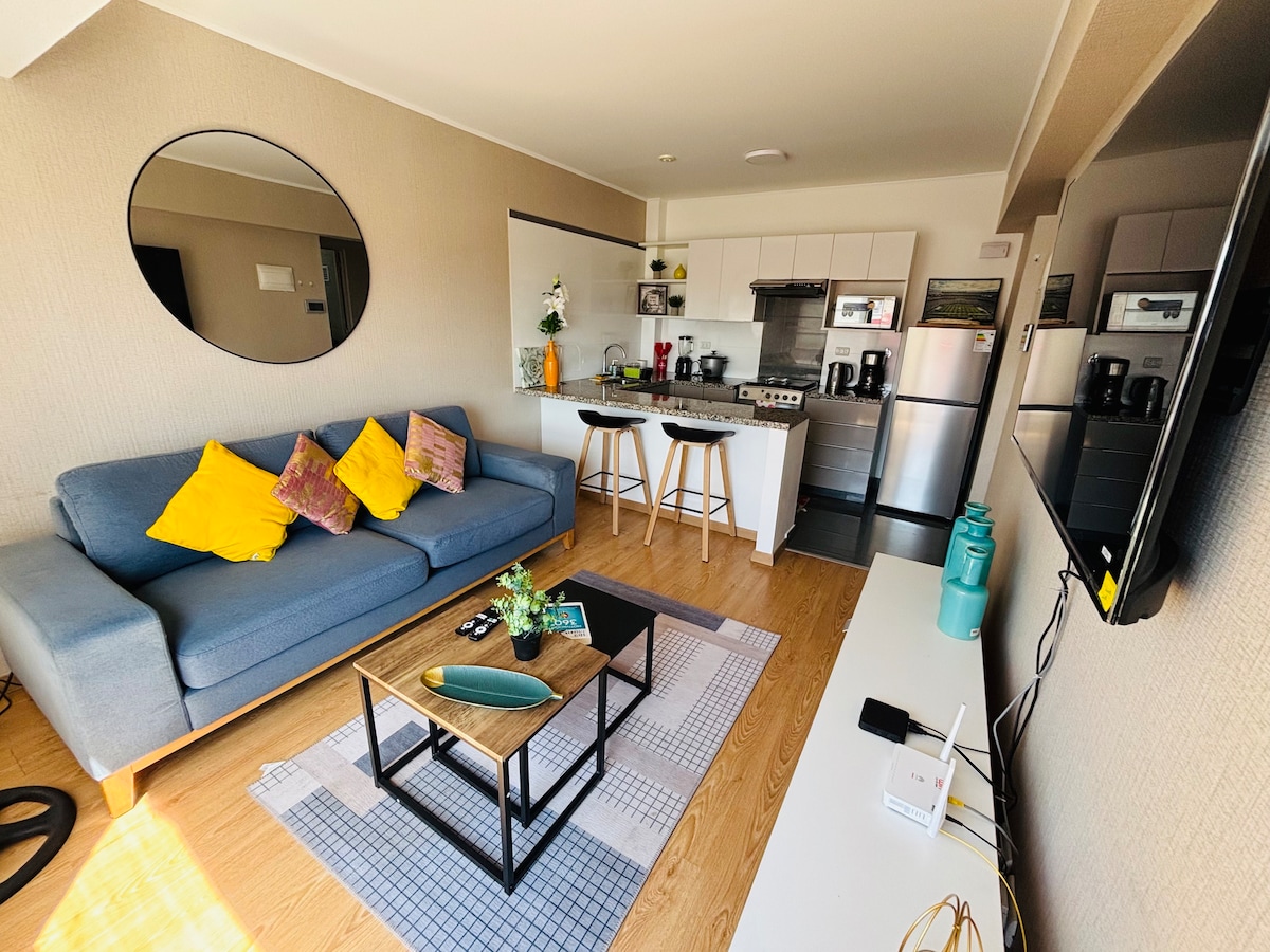 Moderní plně zařízený byt, ideální pro dlouhodobé pobyty. K dispozici je vysokorychlostní Wi-Fi, 65palcová chytrá televize s Netflixem a Disney+, plně vybavená kuchyň s kávovarem na espresso a vodním filtrem, pračka se sušičkou, manželská postel a balkon. Budova nabízí bazén, posilovnu a coworkingový prostor. Samoobslužný proces ubytování 24/7, chytrý klíč, bezplatné parkování a 24hodinová ostraha. Strategicky umístěný v San Miguel, v blízkosti univerzit a nákupních center a méně než 20 minut od letiště.