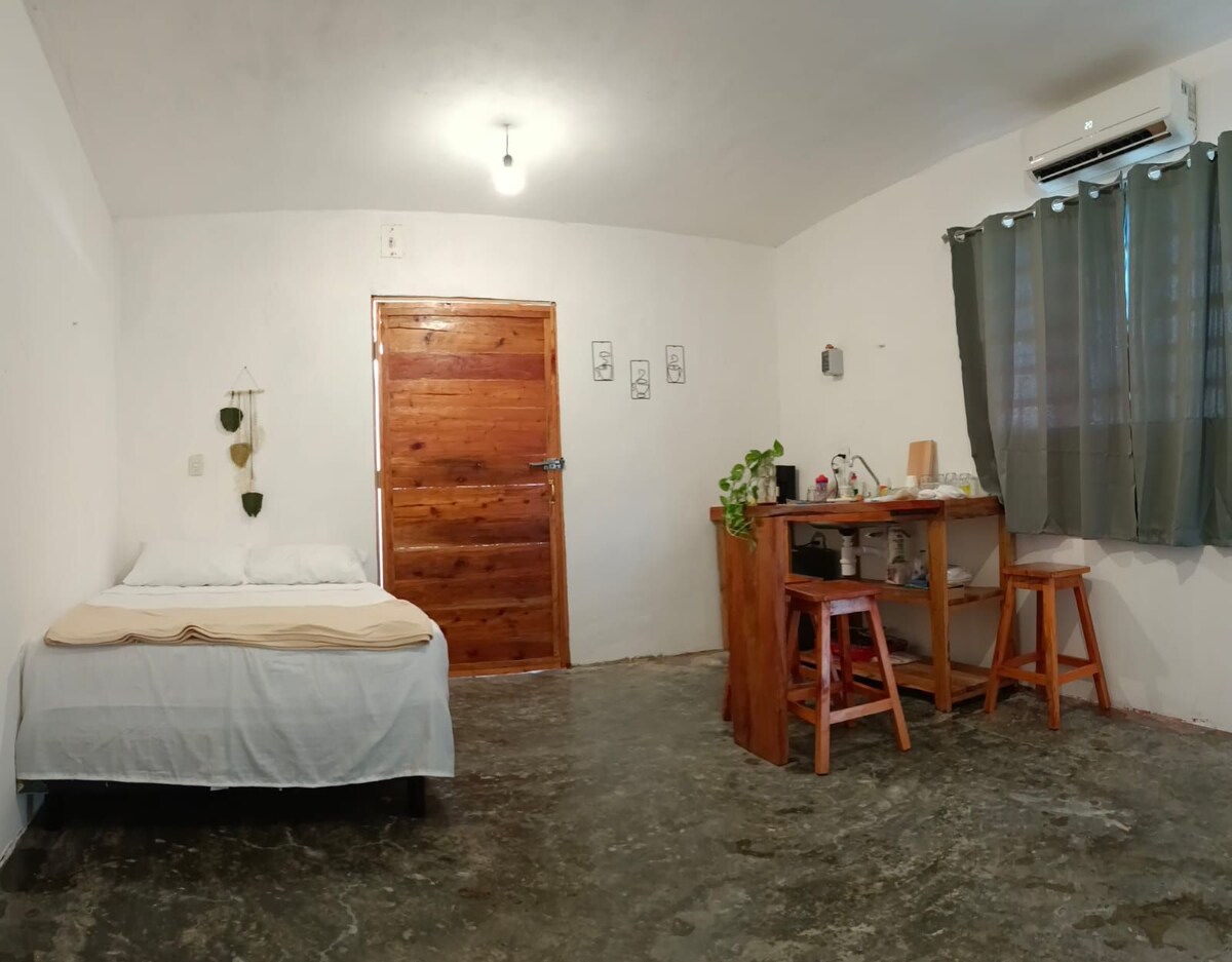 Apartmán typu studio pro 2 až 3 osoby v fracc. Los Aguacates, 2 minuty od zoo, 7 minut od centra a 6 minut od výstaviště Feria de Reyes. Velmi blízko k výjezdu do Méridy. Vybavení: - Manželskou postel a houpací sítě (houpací sítě nejsou součástí dodávky) - Snídaňový bar - Kuchyně s minibarem, kávovarem, grilem a nádobím - Kabelová televize a Amazon Prime Video - Koupelna a teplá voda - Klimatizace - Wi-Fi