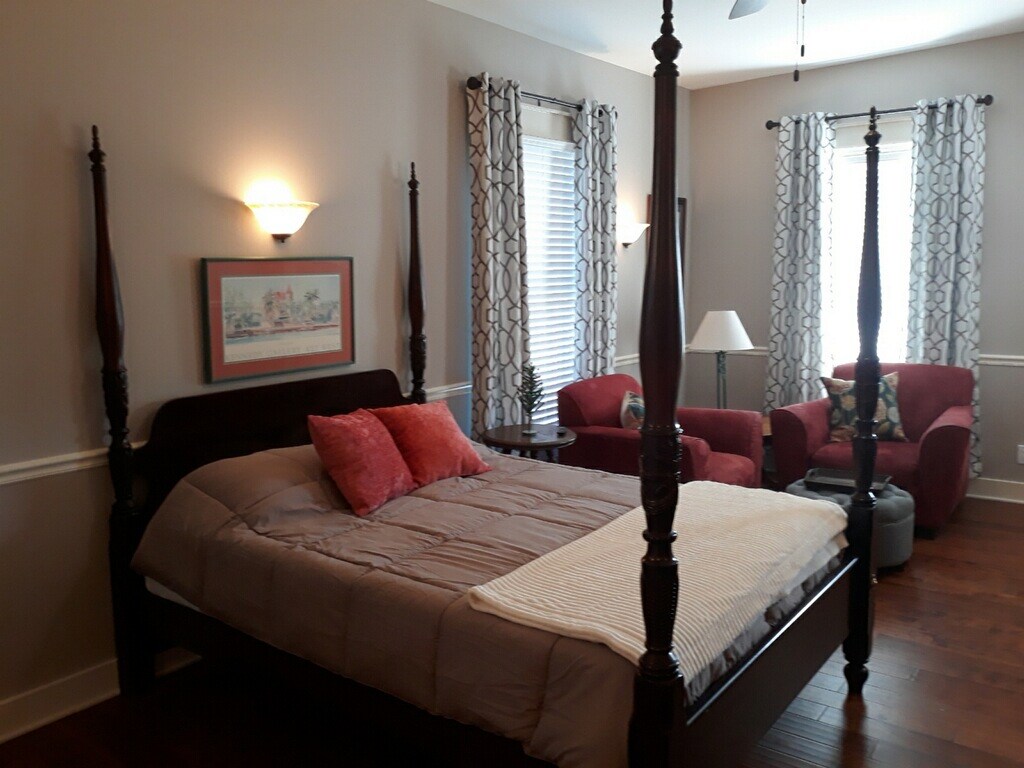 Pokoj je samostatný, má kuchyňský kout, zatemňovací závěsy a sklápěcí manželskou postel. Má jedno vyhrazené parkovací místo a samostatný vchod. Jednotka má vlastní koupelnu, šatnu a kuchyňku. Má také lednici, kávovar, pracovní stůl, mikrovlnnou troubu, 42" chytrý televizor, fritézu Ninja a gauč. Soukromá veranda se stolem a židlemi. Zavřené/zabezpečené jedno parkovací místo.