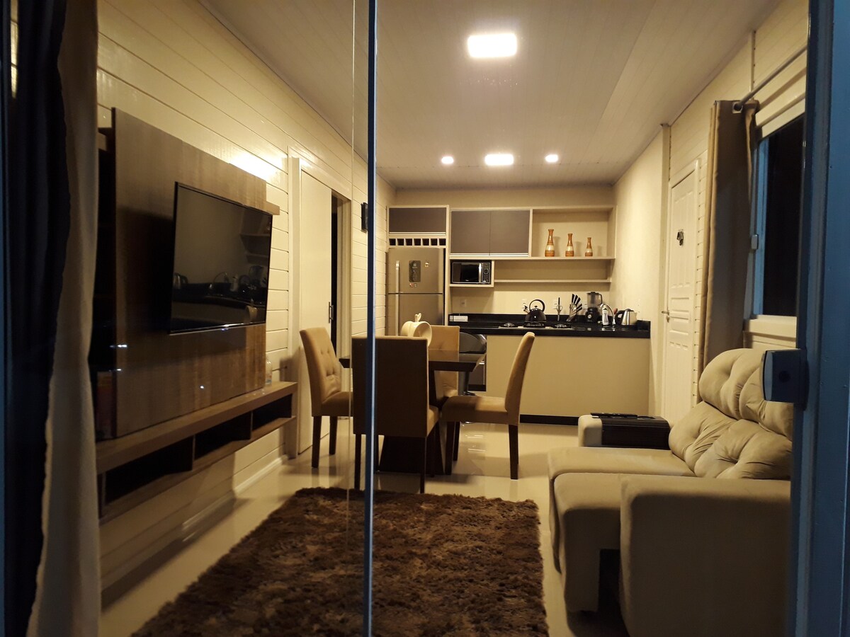 Srub s výhledem na moře mezi lesem a Lagoa. 5 km od pláže Joaquina a dalších východně a jižně od ostrova Santa Catarina a vychutnává si čerstvý vzduch a zpěv ptáků. Všichni s láskou zařídili, aby je přivítali. V blízkosti supermarketu a vymožeností. Pro dvě osoby na dvoulůžkových nebo jednolůžkových postelích v případě potřeby. Má kuchyňský kout (dřez,sporák,minibar,mikrovlnná trouba,mixér a nádobí). Ložní prádlo a ručníky jsou k dispozici.