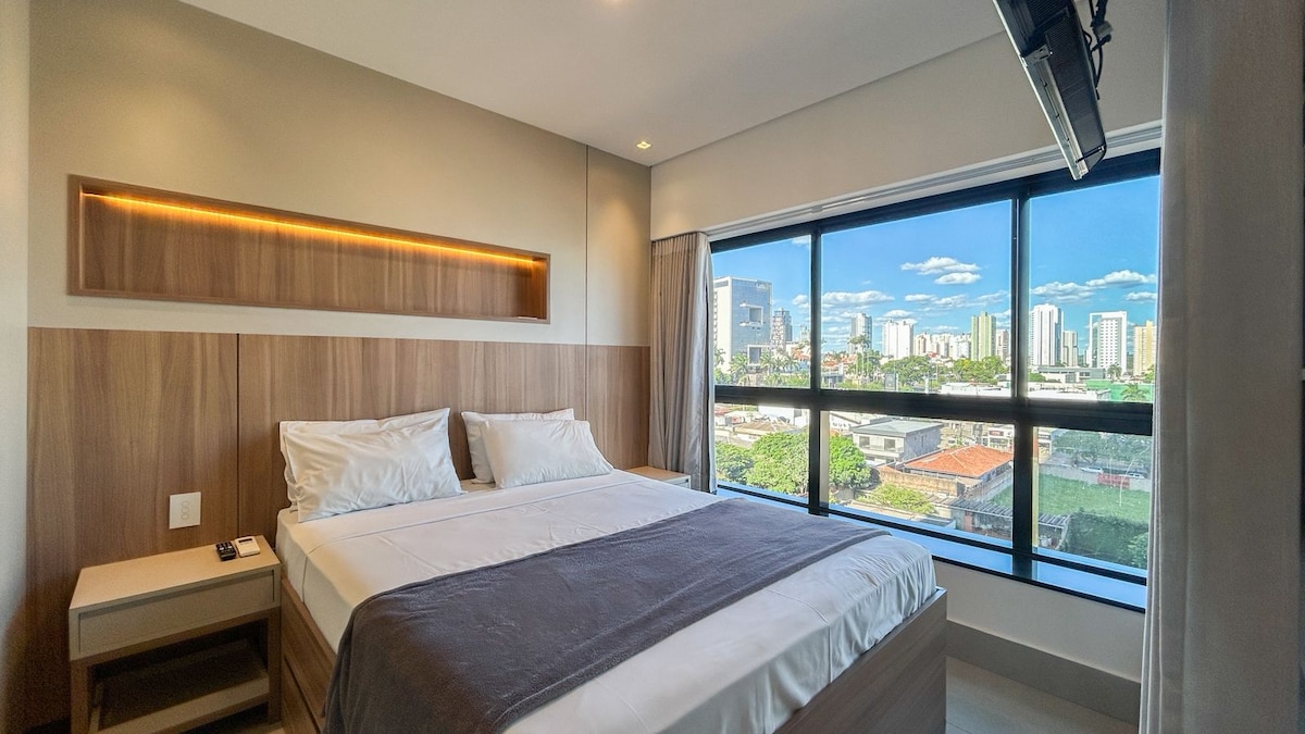 Moderní studio v Jardim dos Estados s panoramatickým výhledem a kompletní strukturou. Pojme až 4 osoby (manželská postel + rozkládací pohovka), má klimatizaci, 300 mbps Wi-Fi, vybavenou kuchyň, dvě chytré televize a soukromou krytou garáž. V budově: vyhřívaný bazén, nekonečný bazén, suchá sauna, fitness centrum, coworking, herna a prádelna (placené využití). 24hodinový concierge, panoramatický výtah a spousta pohodlí v jedné z nejlepších lokalit ve městě.