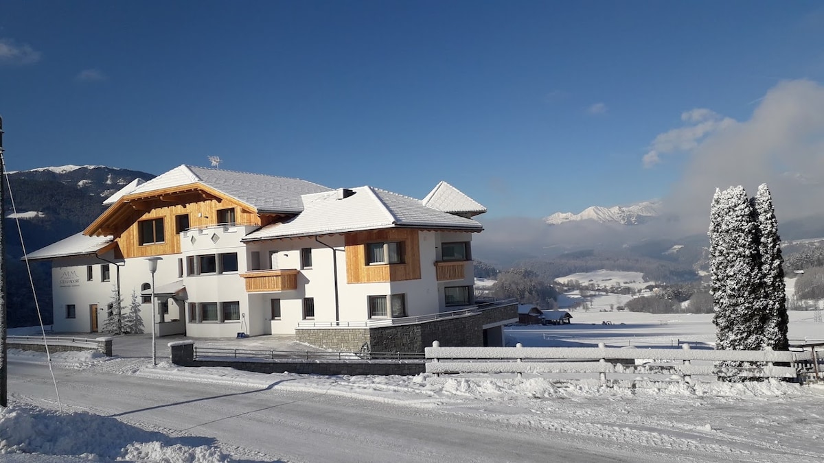 This cosy apartment is ideal for up to 5 people, even for longer stays. You can park your car in the underground car park. The south-facing balcony gives you a great view on the Dolomites and the Kronplatz, just 10 km from the apartment. Bruneck, the main city of the Valley, is located about 5 km from Pfalzen (pullman every 30 min).