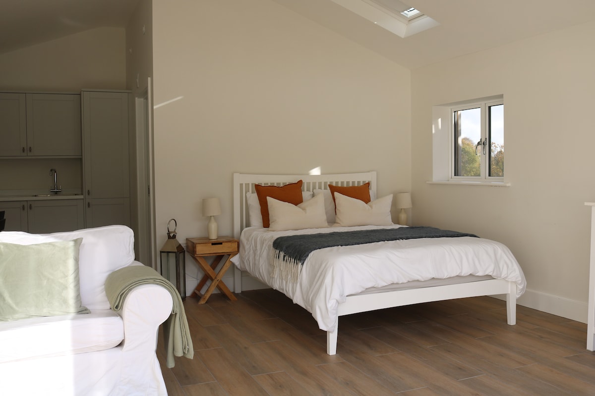 Klidný únik, se vším potřebným pro krátký pobyt. Stylové moderní samostatné studio se soukromním vchodem. Moderní sprchový kout a kuchyňský kout s jídelním koutem a manželskou postelí. K dispozici je společná zahrada s vlastním jídelním a odpočinkovým prostorem. Máme krásného malého psa, který je velmi přátelský, a také občas navštěvující přátelské rodinné psy, kteří mohou být na zahradě, aby pozdravili.