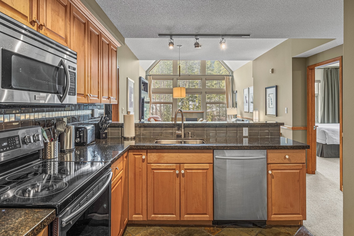 Odpočiň si v tomto moderním bytě s 1 ložnicí a 1 koupelnou, zrekonstruovanými podlahami z borovicového dřeva a výhledem na hory. Užij si plně vybavenou kuchyň, prádelnu, manželskou postel King, rozkládací pohovku Queen, dvě televize a soukromý balkon s grilem. Po prozkoumání si odpočiň ve vířivce nebo nech děti šplouchnout do krytého vodního parku. Zakonči den v pohodlí a klidu. OBCHODNÍ LICENCE Č.: RES-10385