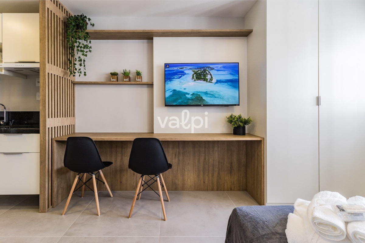Studio s výhledem do parku a automatizací/Alexou. Uzavřená garáž, kuchyň se základními položkami a ložní/koupelnové prádlo. Nachází se v centrální oblasti, střecha s bazénem, posilovna a coworking. Park Redenção je jen pár metrů daleko, o víkendech se koná bio trh a Brique, v Refúgio do Lago se podávají gastronomické speciality a v sále Araújo Vianna se pořádají představení. Vedle barů, restaurací a nočního života v centru města/čtvrti Bom Fim. Snadný přístup do Guaíba Orla, univerzit, nemocnic a dalších čtvrtí.