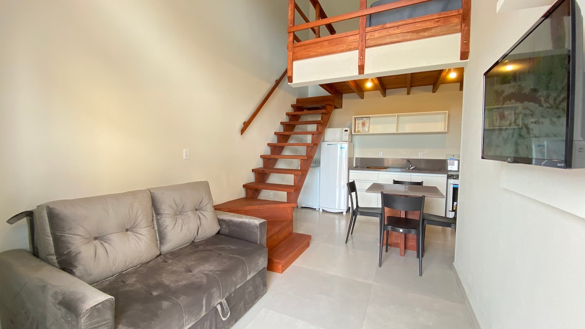 Loft belíssimo, alto padrão e totalmente mobiliado. Bem iluminado, ventilado, novo em empreendimento de alto padrão entregue recentemente. Possui cama de casal, sofá com cheise e TV com Chromecast. A 250 metros da praia, meia quadra da Avenida Ubirajara e a uma quadra da Avenida Paraguaçu. A locação é para 3 pessoas. Observações: -não oferecemos roupa de cama nem roupa de banho -não possui garagem -possui 2 cadeiras de praia -possui guarda sol