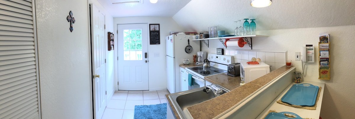 The Nest has undergone a major renovation/expansion with the addition of a full kitchen/dining and separate bedroom. It is an adorable, lavishly decorated lower level, 700 sq ft cottage on a large property located along the Indian River and three blocks from the heart of Cocoa Village. Laundry facility is next door to the Nest and shared with upstairs unit. It has a private courtyard. Parking onsite for one only normal-sized vehicle. No Cleaning Fee on 1-2 day stays. Max two guests.