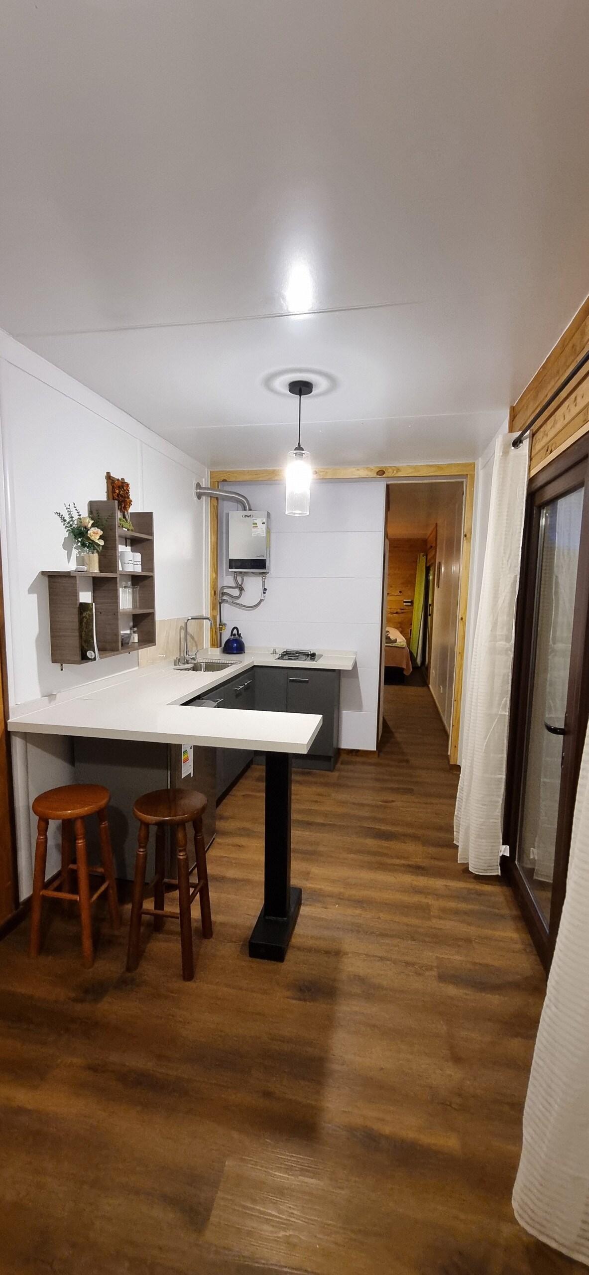 This unified space has everything in a single environment, its beds are comfortable, all its elements are made of native wood and its box to leave shoes is wooden with agate stone from Puerto Guadal Beach. Jeho koupelna je soukromá, kuchyň je plně vybavena minibarem a je součástí prostoru.