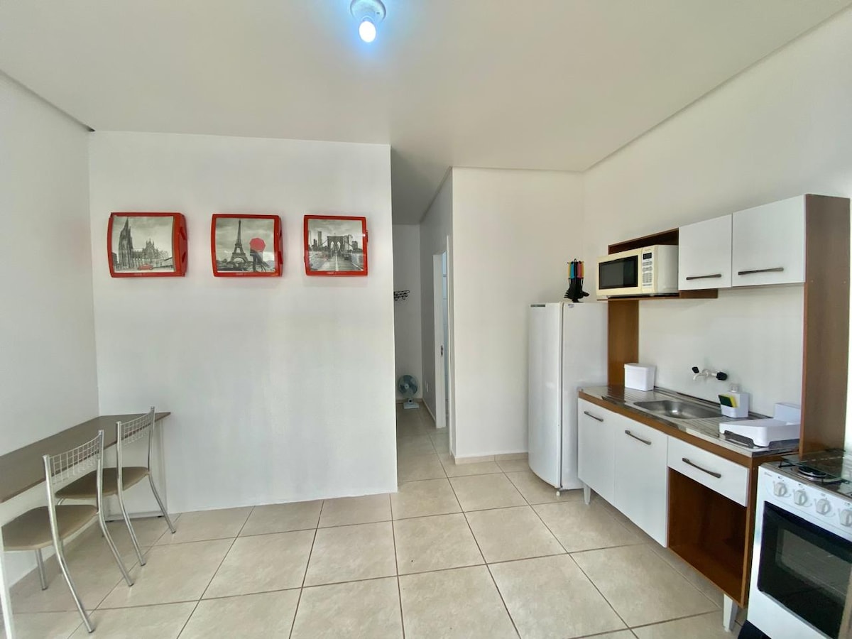 Kitnet prática e funcional para sua estadia, com ótimo custo-benefício Ideal para viajantes a trabalho, estudantes ou quem busca estadias de curta ou média duração com conforto e economia. Imóvel compacto possui 1 dormitório integrado, perfeito para até 2 hóspedes que valorizam praticidade e organização. Localizada em um bairro residencial tranquilo, com fácil acesso a serviços, mercados e transporte. Importante: não possui vaga de garagem. O veículo pode ser estacionado na rua em frente.
