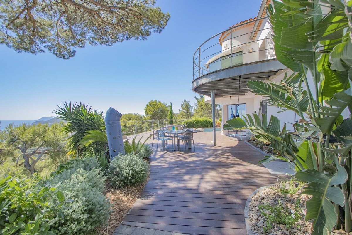Contemporary 🌅 villa “Héméra” managed by La Conciergerie du Rivage, including 4 bedrooms, several terraces with panoramic sea views, a salt-heated pool and a jacuzzi. Klidně se nachází v srdci soukromého a bezpečného panství California Varoise, má výhled na záliv Carqueiranne a nabízí výjimečné panorama, od přístavu Toulon až po Porquerolles. Pouze 10 minut jízdy na pláže (včetně Almanarre) a 20 minut na molo do Porquerolles.