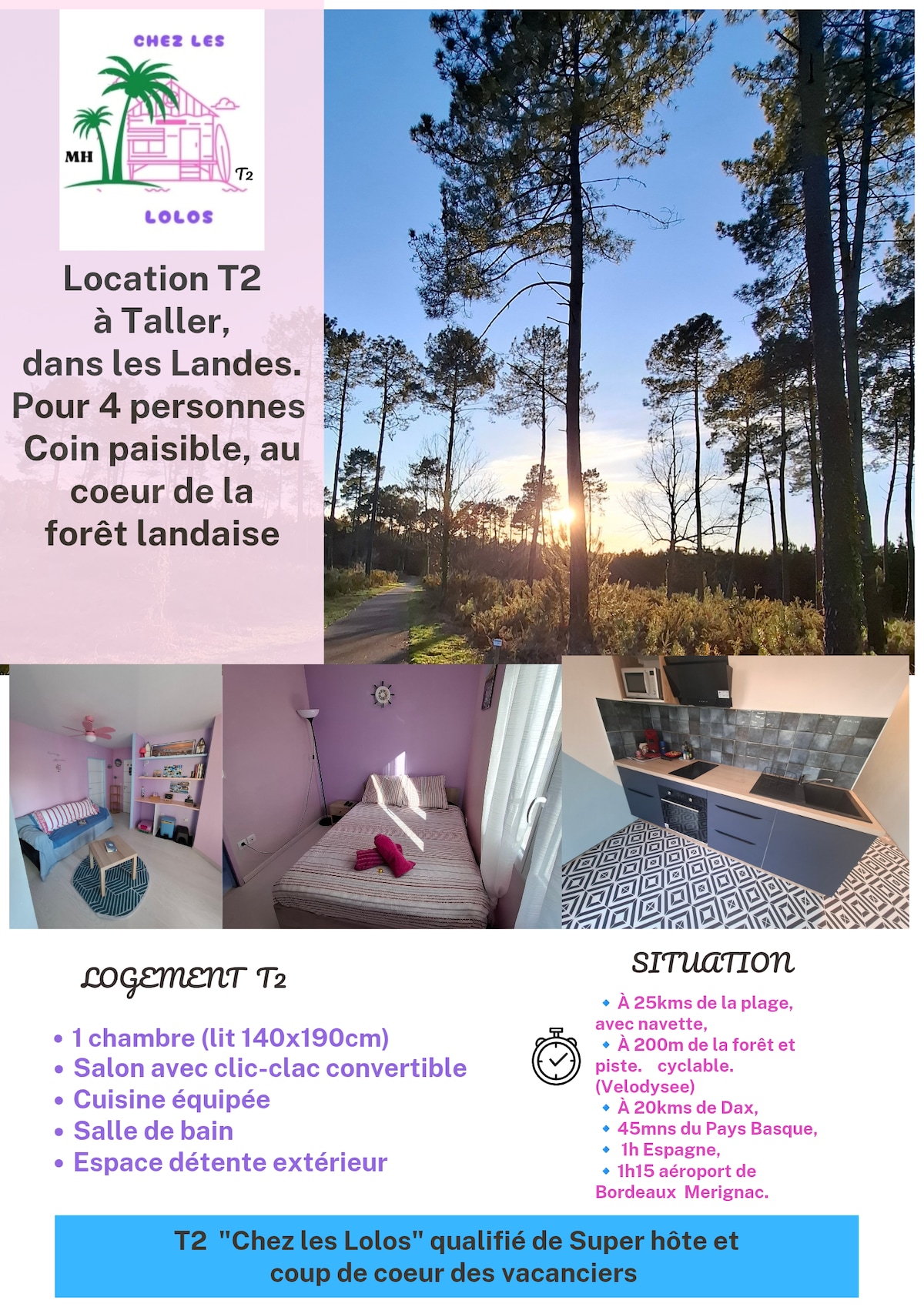 Pár kroků od centra města, mezi pláží a lesem, v 1. patře malého kondominia: Velké studio "duplex", světlé a zrekonstruované, s prostorem na spaní v patře Hosté si mohou vychutnat vybavený venkovní prostor (zahradní židle) ve dvoře kondominia K dispozici jsou 2 kola pro dospělé, (+ dětská sedačka, dětská postýlka, dětská židlička na vyžádání na vyžádání) pro úspěšnou dovolenou! V přízemí: 1 rozkládací pohovka 140 cm, nahoře: 2 lůžka 80 cm nebo 1 lůžko 160 cm