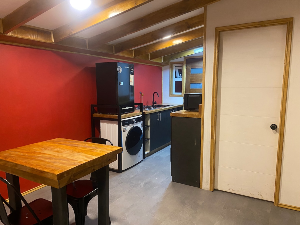 departamento con todas las comodidades para una estadía tranquila y segura ya sea de vacaciones o trabajo cuenta con un dormitorio cama 2 plaza matrimonial y un dormitorio cama 1 1/2 , ropa de cama y toallas , living comedor cocina equipada completamente , combustión a pellets, refrigerador, ducha agua caliente, estacionamiento gratuito y seguro con portón eléctrico lavadora cercano a universidad, bypass, supermercado a 7 min del centro o plaza de armas de la ciudad castro chiloe