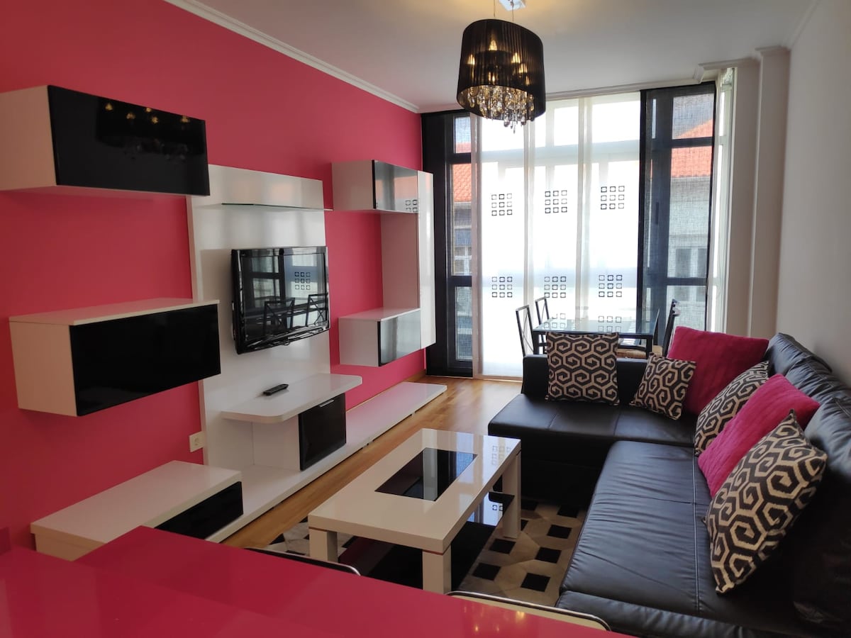 Vynikající apartmán s terasou, DVOJITÉ parkovací místo 3 minuty pěšky. Vše, abyste se cítili jako doma. 500 metrů od pláže Orzán (MÉNĚ než 5 minut pěšky) 700 metrů od nejznámějšího náměstí La Coruñy, María Pita. Má ložnici s manželskou postelí, prostorný obývací pokoj s 55" TV s NETFLIX, WiFi a rozkládací pohovkou 1,60 x 2,00 metrů s viskózní matrací. K dispozici je vybavená kuchyně a venkovní terasa se stolem, kde si můžete užít. Vše budete mít na dosah ruky přímo v centru.