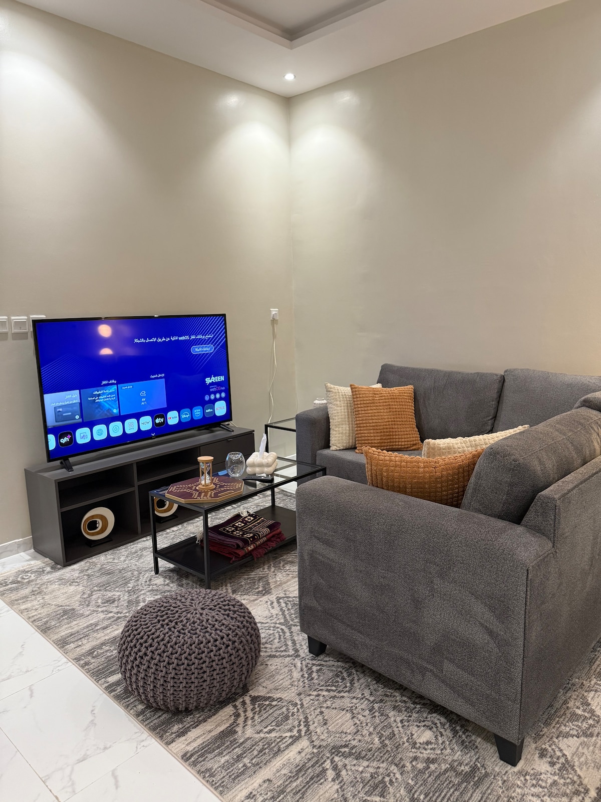 غرفة وصالة مودرن | شاشة 70 بوصة ، دخول ذاتي