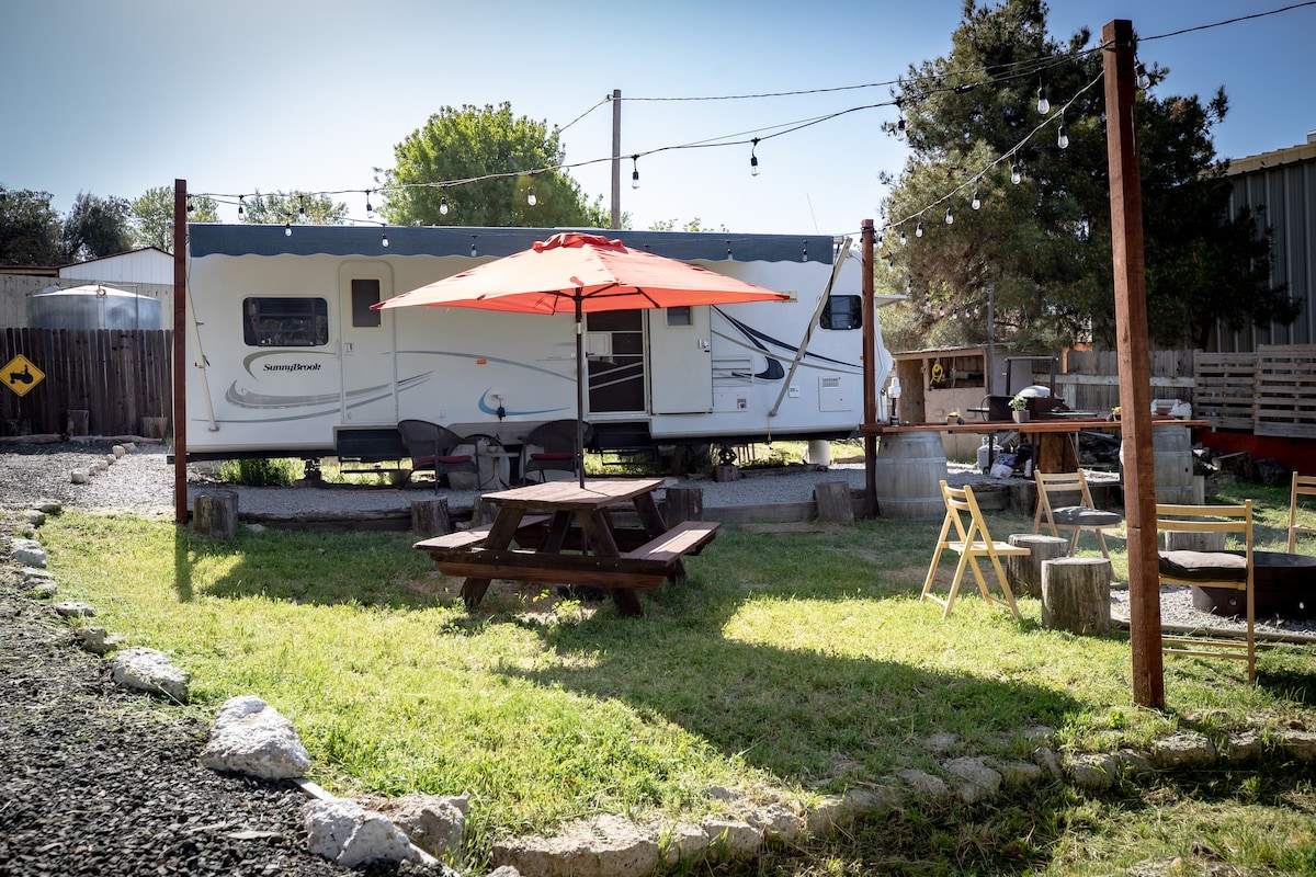 This fully renovated 5th wheel has everything you need, plus No Cleaning Fee! Situated on a hilltop in a quiet foothill neighborhood, you'll have a lovely view of our little valley and mountains. It sports a full kitchen with basics for cooking, RO for purified water, fridge/freezer, coffee maker & , Amazon Fire TV, WIFI, small but well equipped full bathroom, natural latex queen sized bed, AC & heat. Enjoy coffee and fresh eggs, and while you watch the pigs and chickens graze below.