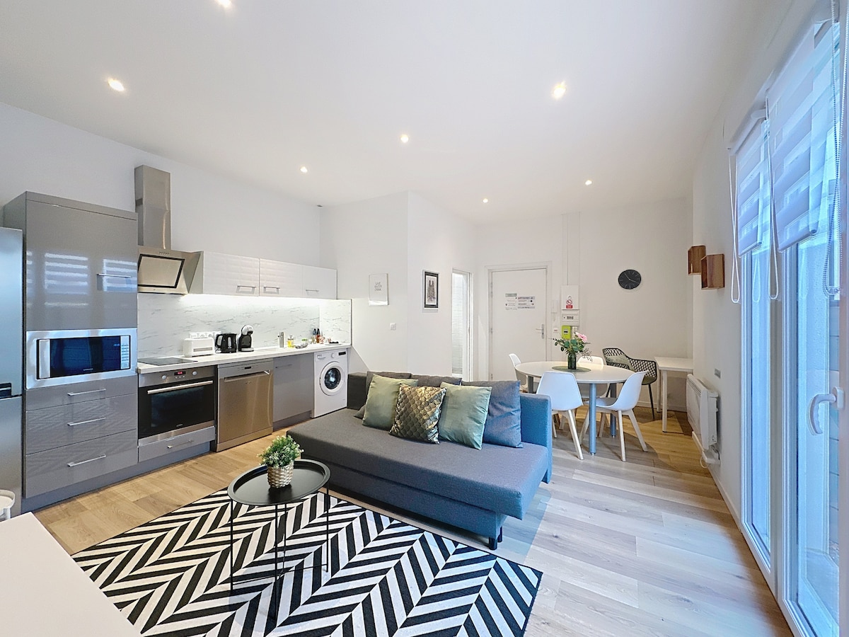 Prosvětlený apartmán o rozloze 32 m² kompletně zrekonstruovaný v srdci Remeše, v klidné budově. 1 ložnice (postel 140x200) s šatníkem, koupelna, otevřená kuchyně, obývací pokoj s rozkládací pohovkou, TV a Wi-Fi. Soukromé vnitřní parkoviště se zásuvkou pro nabíjení elektromobilů. Ložní prádlo je k dispozici. Ideální pro jednoho člověka, pár nebo krátký pracovní pobyt. 1,5 km od vlakového nádraží, v blízkosti obchodů, restaurací, katedrály, ulice Vesle a velkých výrobců šampaňského. Samostatný příjezd.