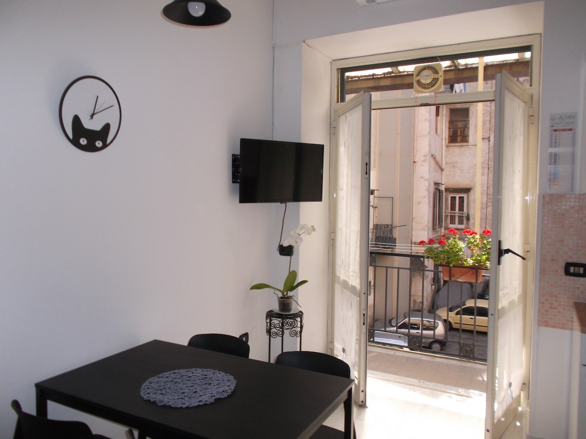 Kouzlo pobytu ve starověkém Neapoli, pár kroků od historických, uměleckých a folklorních míst ............ " V srdci historického centra s jeho rozsáhlým uměleckým a architektonickým dědictvím, které UNESCO prohlásilo za světové dědictví. Díky strategické poloze domu poznáte skutečný Neapol, který je celý v docházkové vzdálenosti ... všude kolem vás ... " Katedrála, Decumani, podzemní Neapol, starověké kostely, pizzerie, řemeslníci a slavná S. Gregorio Armeno (ulice betlémů a pastýřů) jsou jen pár kroků daleko. Apartmá se nachází v prvním patře barokního domu a jeho pokoje byly renovovány s vkusem a rafinovaností, aby se zde hosté cítili příjemně a pohodlně. Metro, letiště, vlaková nádraží, přístav a dálnice jsou snadno dostupné. Tento romantický dům, v elegantní vínové barvě, může pojmout až čtyři osoby. Skládá se z krásného a prostorného obývacího pokoje s francouzskou rozkládací pohovkou a jídelní části s plně vybavenou kuchyní. Má podkroví s manželskou postelí a koupelnu se sprchovým koutem. Apartmán je vybaven veškerým komfortem, TV, bezdrátovým připojením, nezávislým topením a klimatizací.