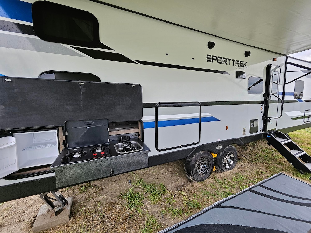 Make lasting memories at the coast in this welcoming SportTrek bumper pull, perfectly nestled along a peaceful canal where bay breezes and water views set the tone for a relaxing getaway. Whether you’re traveling with family or friends, this spacious RV offers all the comforts of home with a laid-back beach vibe. The Space: This RV sleeps up to 6 guests and features a private queen master bedroom and two cozy queen bunk beds, perfect for kids or additional guests. Both the master and living area are equipped with Smart TVs, and the open living space includes a cozy fireplace for those laid back evenings indoors. The fully stocked kitchen has everything you need to cook up your favorite meals, with plenty of space to gather, dine, and unwind after a day at the beach or on the bay. Outside, the adventure continues with access to a wide range of resort style amenities. Fish or crab right off the private dock, cruise the canal in a kayak, hop on a bike to explore the area, or let the kids run wild on the pirate ship playground. The palapa area offers the perfect hangout spot with a grill, picnic tables, and corn hole. From marshmallow roasts by the fire to sunrise coffee with a view, this bayside retreat is the perfect spot to unwind, reconnect, and enjoy the beauty of the coast.