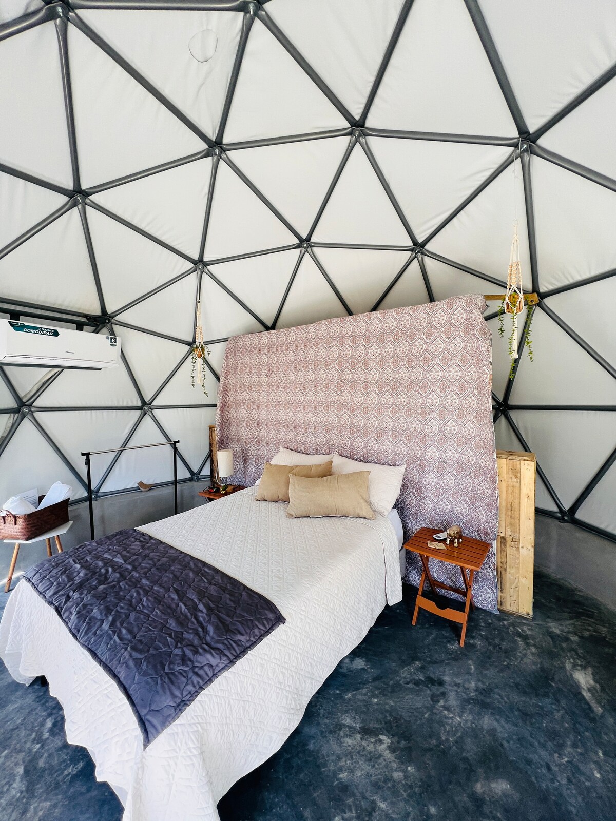 Krytý kemp v zalesněné oblasti s krásným výhledem, soukromou palapou, dřevěnou podlahou, elektrickou instalací, osvětlením a sdílenými ekologickými koupelnami pro větší pohodlí. V ceně je zahrnuta glamping pro 2 osoby vybavená matrací, ventilátorem, povlečením, polštáři, ručníky a mýdly za 500 $ v každém ubytování. Platba zahrnuje také přístup ke všem zařízením místa, jako je restaurace, toalety, sprchy, volejbalová síť, houpací sítě, plážová křesla a molo.