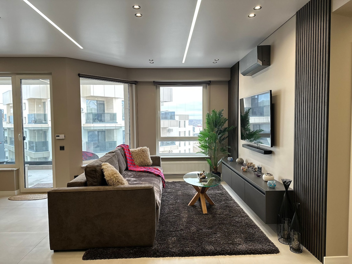 Byt se nachází v nově postavené moderní a technologické budově. Design je elegantní a rafinovaný. Velký obývací pokoj má veškeré pohodlí, aby byl příjemný, a váš pobyt a od okenních dveří je osvětlen na terasu o rozloze 66 m ². Strategická poloha v centru umožňuje rychle se dostat na letiště. Před apartmánem je nejlepší trh v Moldavsku a 1 km daleko je Malldova, hlavní nákupní centrum v Kišiněvě.
