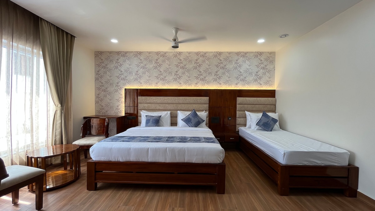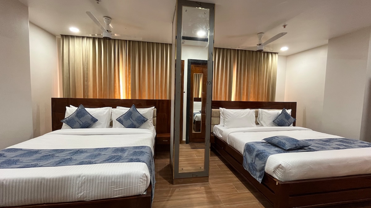 A premium 3-star hotel nestled in a peaceful temple town, thoughtfully designed to offer comfort, elegance, and tranquility. The hotel features tastefully furnished rooms with modern amenities including high-speed Wi-Fi, air conditioning, smart TV, and well-appointed bathrooms. With a pure vegetarian dining option, ample parking and 24-hour front desk, the hotel is ideal for pilgrims seeking a refined stay without compromising on serenity and value.