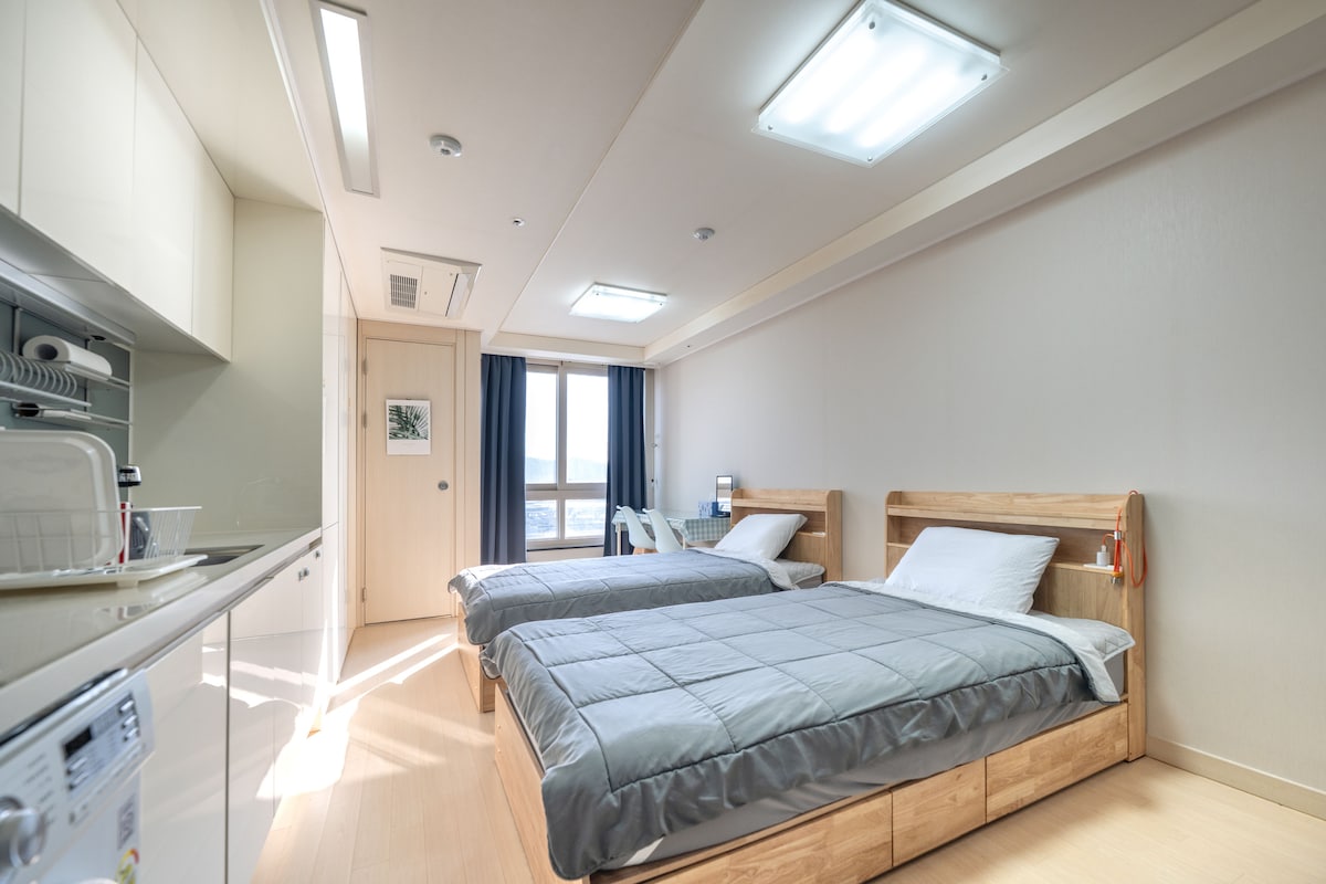 Je ❣️čistý a vybavený kompletními možnostmi, takže se můžeš pohodlně ubytovat na krátkou i dlouhou dobu. Okolní prostředí je tiché a sluneční světlo je dobré, takže dům je světlý.K pokoji je připojena také soukromá terasa a na střeše je společná terasa. Je to super jednolůžko, takže budeš mít dostatek prostoru a pohodlí. 👍 Ručníky/vlasové produkty/tělové produkty/dezinfekce rukou/nádobí/vše je vybaveno. Je mým štěstím, že má 🥰host pohodlný pobyt ~♡ K dispozici je také stůl na venkovní terase, kde si můžete odpočinout, takže je ještě lepší ho využít. V blízkosti jsou také obchůdky, tržnice, tradiční trhy, jídlo, knihovny, autobusové zastávky, metro atd.👍👍 Přímá linka limuzíny z letiště Incheon (meziměstský autobusový terminál Songtan) Vystup a běž pěšky do ubytování, je to asi 5 minutová procházka~♡