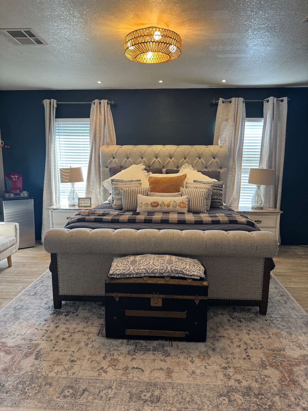 Odpočiňte si v tomto minimalisticky navrženém pokoji s luxusem vlastní mini kavárny a pracujte z domova. Tento soukromý prostor nabízí mini ledničku, bezplatný čaj a kávu, mikrovlnnou troubu, jídelní stůl pro 2 osoby, soukromý venkovní prostor s vlastním krbem, kde si můžete užít počasí v El Paso; a nezapomeňme na stůl s monitorem a vysokorychlostní internet! Studio je pouze 5 minut od centra města, Plaza Theatre, kongresového centra, UTEP a nočního života!