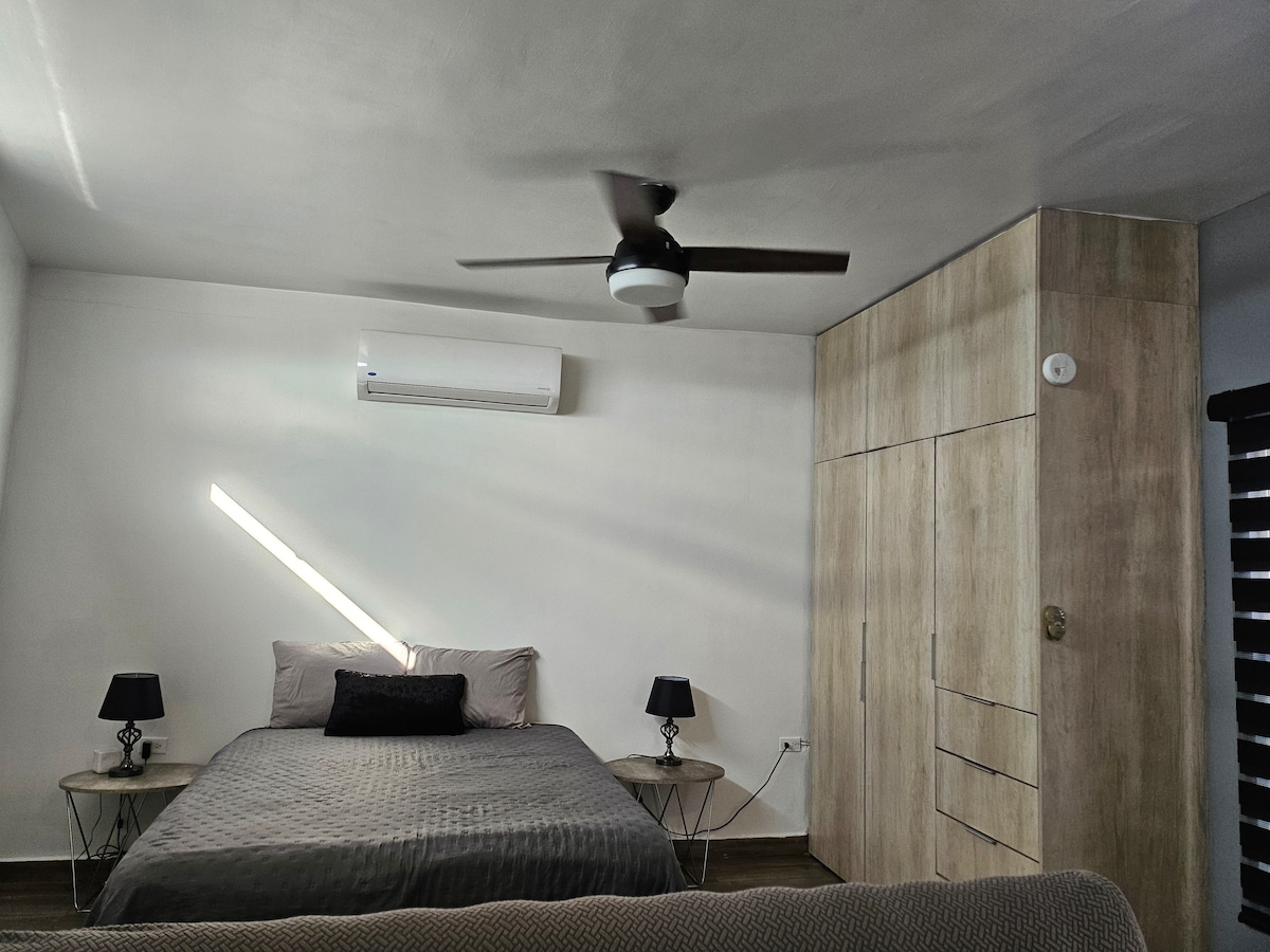 Vychutnejte si pohodlí tohoto klidného a centrálního ubytování, které se nachází pouhých 5 minut jízdy autem od amerického konzulátu a nákupních center. Tento prostor má jednu ložnici, manželskou postel, mini split na chlazení a topení, prostorný šatník, vybavenou kuchyň, rozkládací pohovku, jídelnu, wifi, smart TV. Ideální pro krátkodobé nebo dlouhodobé pobyty, ať už jste na služební cestě nebo na dovolené. Díky své strategické poloze se budete moci snadno pohybovat po městě, ať už hledáte práci, odpočinek nebo objevování.