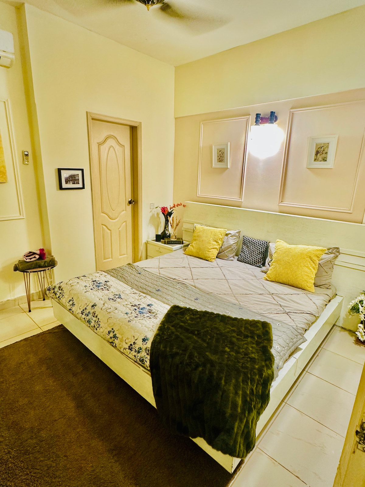Zažij klidné a bezpečné bydlení v našem elegantním bytě ve fázi VIII, DHA Karáčí, 2 minuty od moře a 9 minut od Dolmen Mall a luxusní restaurace. Užij si pohodlí bezplatného každodenního úklidu a úklidu. Auto, řidič a stravovací služba (za příplatek) jsou k dispozici na požádání. Naše prostorné obývací prostory, moderní kuchyně a krásně navržené ložnice s vlastní koupelnou a záložním generátorem zajišťují nezapomenutelný pobyt. Ideální pro rodiny a služebně cestující a nabízí vysokorychlostní Wi-Fi.