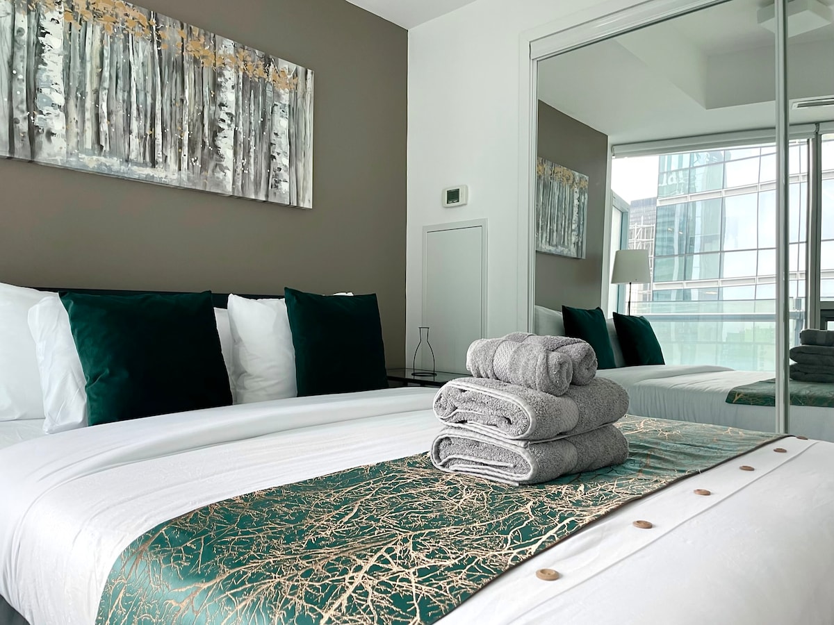 Vítejte v bytě Fort York! Tento prostor se 2 ložnicemi a 1 koupelnou byl promyšleně zrekonstruován pomocí směsi moderního a současného dekoru, aby vytvořil relaxační, luxusní místo, kde si můžete odpočinout a zároveň si užít vše, co centrum Toronta nabízí. Díky naší poloze a chytré schránce na klíče umístěné u předních dveří je příjezd do bytu snadnější než kdy jindy, nemusíte se obávat, že budete muset řešit personál recepce nebo čekat na výtahy.