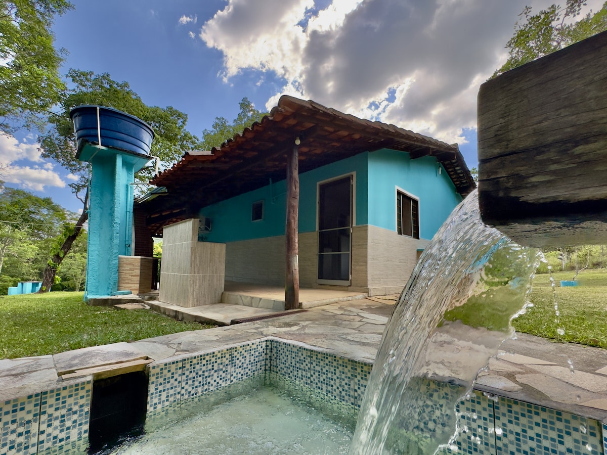 Chalé aconchegante cercado de mata, acesso exclusivo à cachoeira e dois poços de água limpa (5min a pé). Internet fibra óptica. Ideal para um casal (até 04). Não recomendável para idosos (70+), bebês ou crianças pequenas. Ler observações. Permitido pet de pequeno porte.A 10km do centro de Pirenópolis (25 min carro) pela Serra dos Pirineus, 5 Km de estrada de terra acidentada. Ambiente propício ao descanso, à introspeção e ao amor .