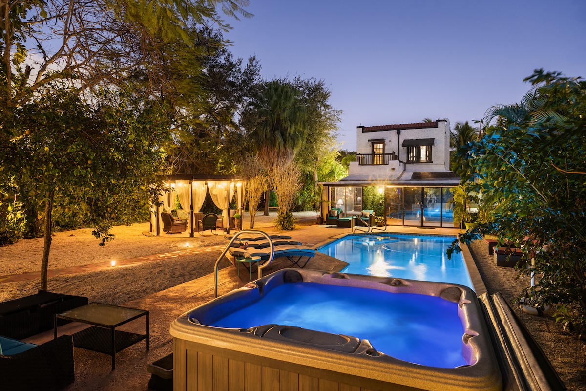 O so Chic Miami vila jen pár minut od restaurací a nočního života Brickellu! Odpočiň si ve vyhřívaném bazénu a lázních, popíjej kávu na slunečné terase na zahradě a pak si odpočiň v luxusních manželských postelích. Superhostitel • Oblíbené u hostů • Hodnocení 4,98 hvězdiček ve více než 200 hodnoceních Ubytování pro 12 osob, 3 ložnice a 4. ložnice/TV místnost. Solární a elektricky vyhřívané bazény Rychlá wifi TV ve všech pokojích Kuchyň připravená pro šéfkuchaře s nerezovými spotřebiči, venkovní gril připravený na vaše vaření nebo soukromý šéfkuchař Hibachi. Koupelnová sada a pantofle