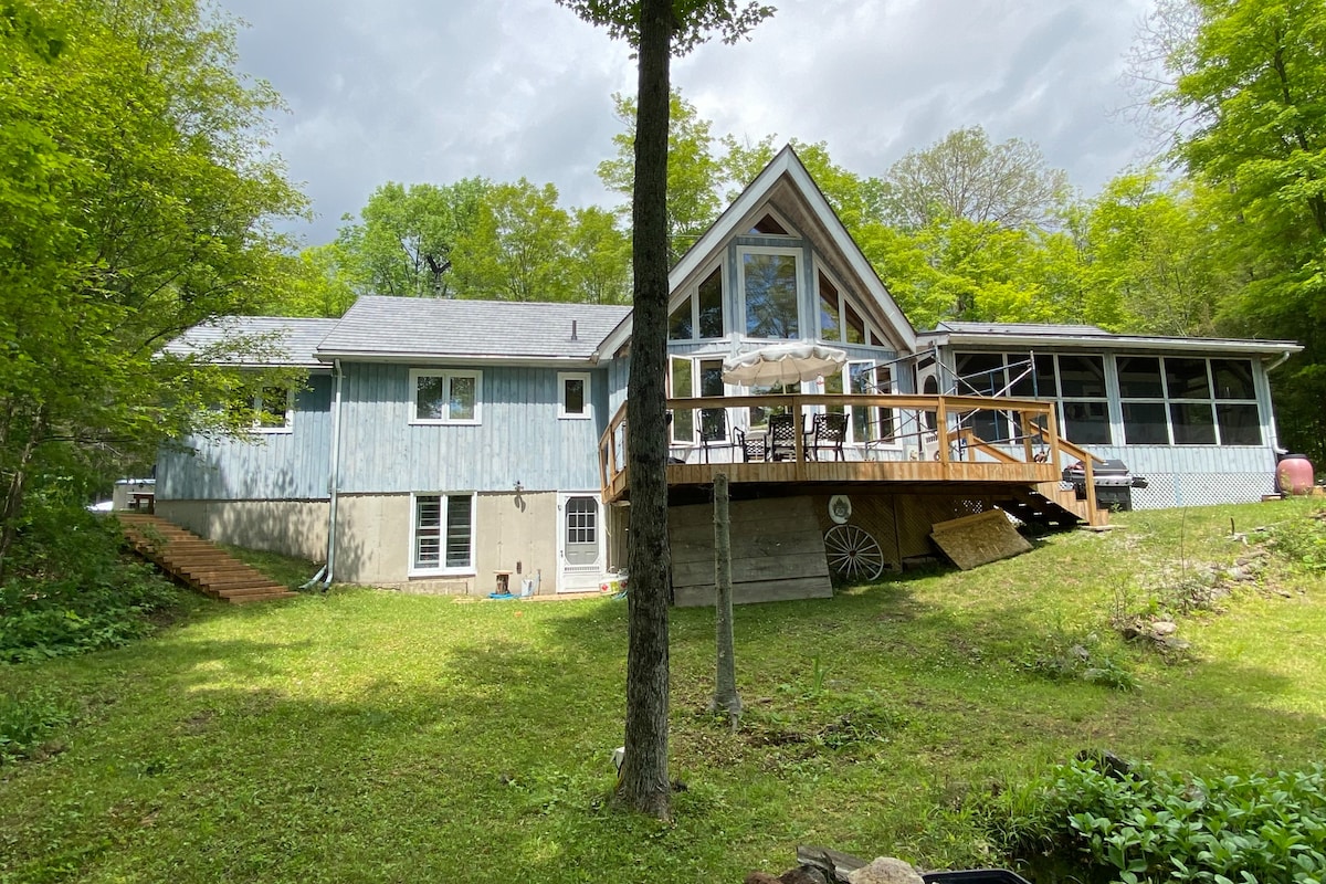 Stay beside the North River in our charming guesthouse cabin. Private riverfront to launch canoes or kayaks Public Boat launch across the road. Short drive to several lakes, the Trent Severn, multiple parks, extensive off roading & snowmobiling trails. Single loft with two twin beds that can easily be put together to make a king and a comfy queen size sofa bed on the main floor. Wood stove is the primary heat. Well cared for pets and their responsible owners are welcomed!