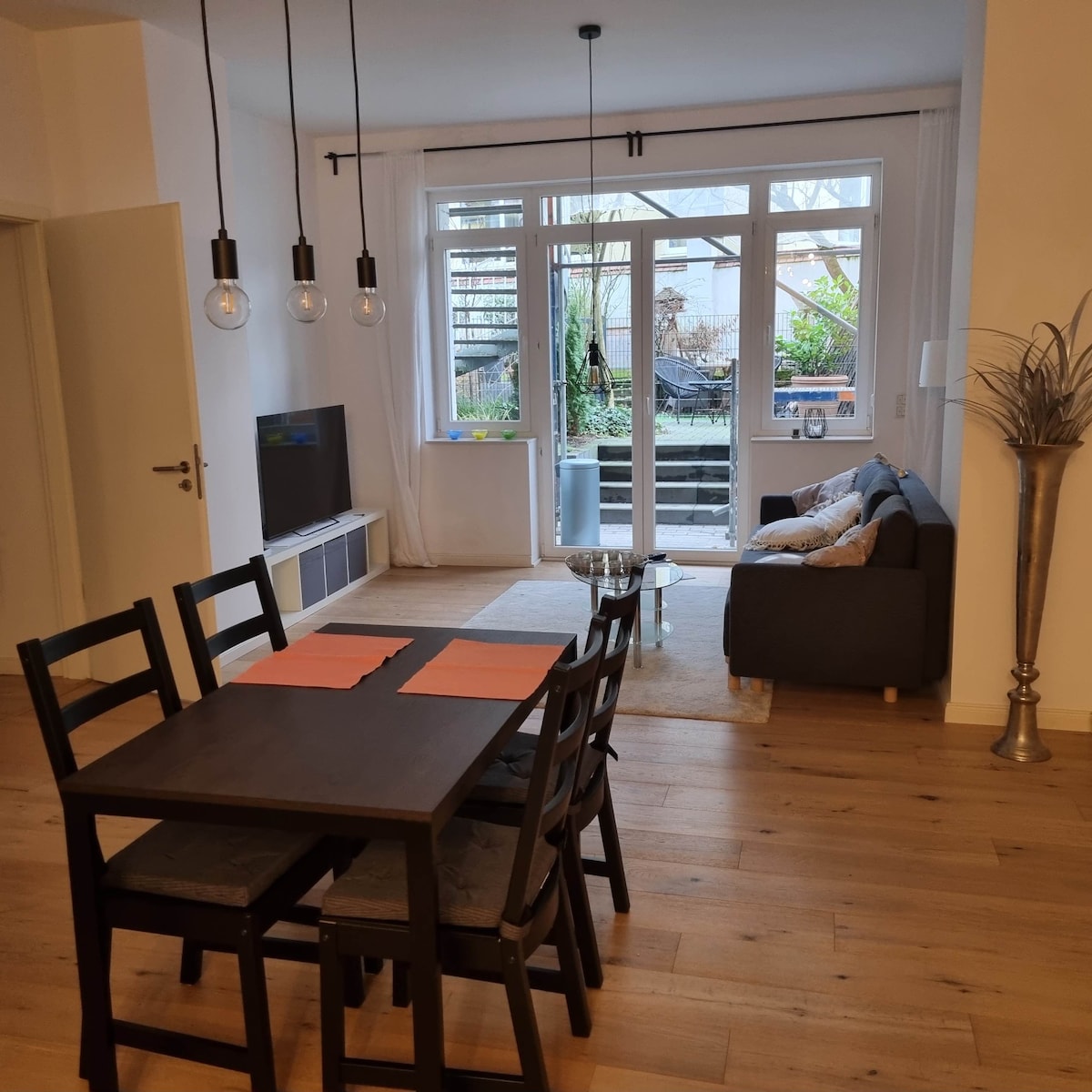 Krásný 1-pokojový apartmán (přízemí) ve staré budově se samostatnou kuchyní a světlou moderní koupelnou se sprchovým koutem a oknem. Pokoj má manželskou postel (1,80 m), TV a bezplatné Wi-Fi. Ručníky se mění každý týden, ložní prádlo každých 14 dní. Na nádvoří je posezení (pro kuřáky). V okolních ulicích je k dispozici bezplatné veřejné parkoviště. Dobré spojení s veřejnou dopravou (autobusy, 2,5 km do nádraží Neuss), nákupní možnosti a prádelna v okolí.