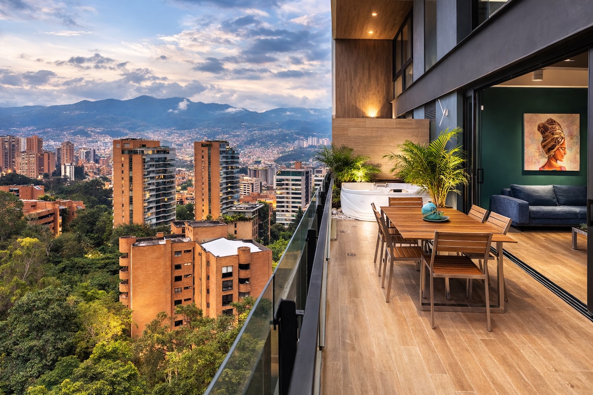 Skvělý bazén na terase budovy Vířivka, sauna a posilovna Balkon s vlastní vířivkou / manželská postel klimatizace Samostatná ložnice a obývací pokoj Restaurace/bar v hale. Pokojová služba Pohodlné a prostorné v moderním designu. Kompletní kuchyně Skvělý výhled na město a hory. V blízkosti nejlepších barů/restaurací ve městě Provenza. Pračka a sušička na plyn v bytě. Ikonická budova v Medellínu Soukromá vířivka na balkóně v 11. patře 1 000 čtverečních stop Rychlá wifi Nonstop příjezd