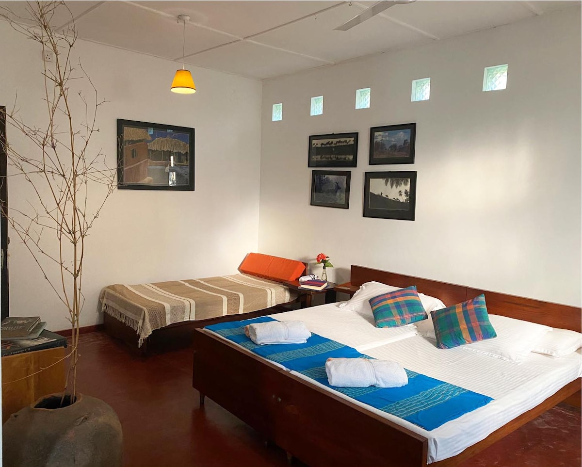 Prostorný, klimatizovaný pokoj s připojenou toaletou se nachází v horním patře našeho domu. Do jednotky se dostanete po jednom širokém schodišti. Má dvě postele (s možností přidání třetí), nástěnné skříňky, šatní skříň, umyvadlo, velký stůl, který slouží jako pracovní prostor/jídelní stůl a kuchyňské vybavení. Knihovna obsahuje fakta a fikci a publikace hostitelů na Srí Lance, s pohodlnými židlemi pro relaxaci a čtení. Stěny zdobí fotografie a obrazy srílanských umělců.